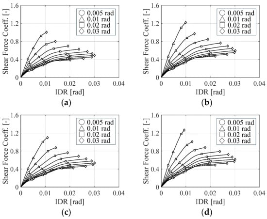Figure 4 illustrates the relationship between lateral load and lateral deformation for the four models in the pushover analysis. The pushover analysis was conducted until the maximum IDR reached 0.03 rad. The figure also displays the steps at which the maximum IDR reached 0.005 rad, 0.01 rad, 0.02 rad, and 0.03 rad. The base shear coefficients at the maximum IDR of 0.01 rad were as follows: Model A: 0.25, Model B: 0.29, Model C: 0.25, and Model D: 0.30, indicating notable variations in structural performance depending on the presence of the floor slab. Additionally, as the steps increased, deformation was observed to concentrate on the lower floors.