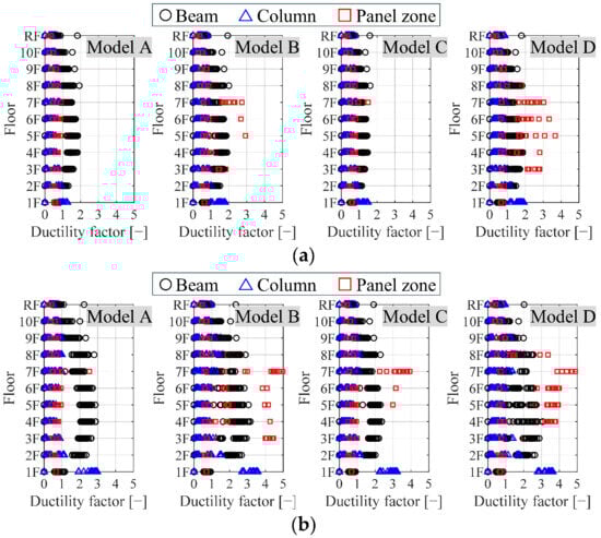 For a detailed distribution of member deformation, Figure 5 shows the ductility factors of individual members at a maximum IDR of 0.02 rad and 0.03 rad. In Model A, significant deformation is predominantly observed in the beams except for the column base of the first story, followed by deformation in the panel zones and columns. In contrast, in Models B, C, and D, which have better beam-end performance, the ductility factors of the panel zones and columns increased. In Models B and D, where the RC floor slab was included, it was observed that the deformation of panel zones surpassed that of the beam ends on certain floors. The influence of member deformation on damage assessment in relation to the IDR will be discussed further in Section 5.