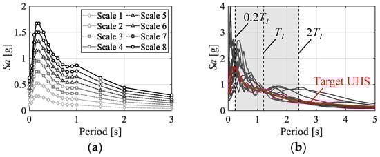 The target acceleration response spectrum generated through these steps is shown in Figure 6a, and the corresponding return periods are listed in Table 4. The fundamental period T1 was set at 1.2 s, as determined from the average eigenvalue analysis results across all models. Figure 6b displays the ground motion set selected for the maximum return period (scale 8).