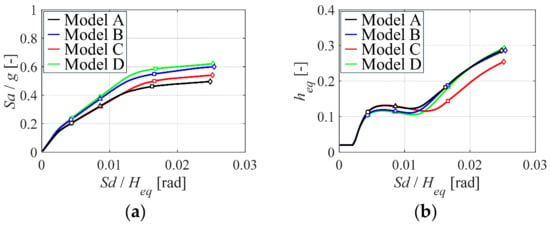 Based on the results from the static pushover analysis, the building’s response is calculated using the CSM. Figure 7a illustrates the capacity curve, which shows the relationship between lateral shear force and lateral deformation for the equivalent SDOF system, calculated using Equations (3) and (4) derived from the pushover analysis results. For equivalent drift ratios, Sd/Heq (Here, Heq is the equivalent height of the SDOF system) below 0.01 rad, where most components remain within the elastic range, there is minimal variation in response due to the differences in welding methods. However, the presence or absence of a floor slab significantly affects the behavior. Beyond 0.01 rad, differences emerge based on welding methods, with shop-welded connections exhibiting higher strength tendencies.