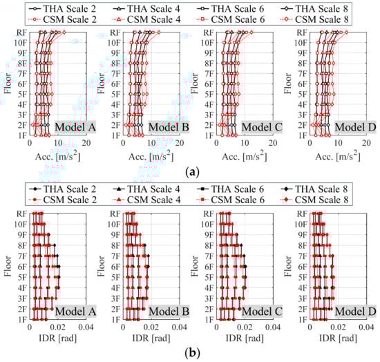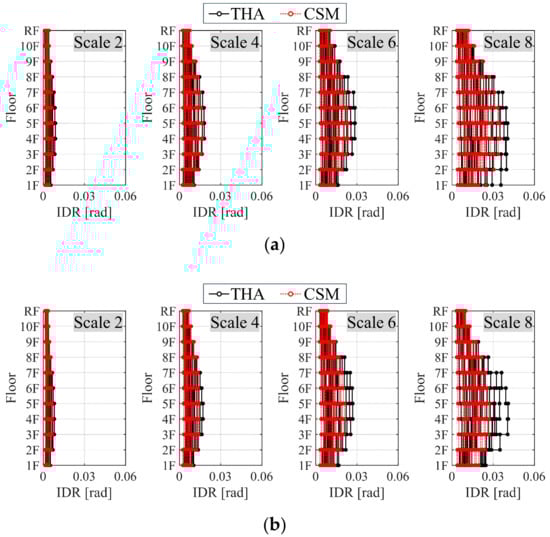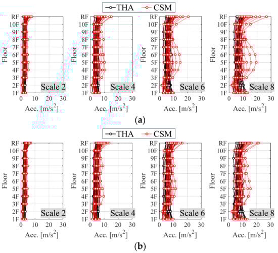 Using the obtained damping curves, capacity curves, and earthquake motion set created in the previous section, the building response for loss evaluation was estimated through the incremental CSM. Figure 8 and Figure 9 show the PFA and maximum IDR for all earthquake motions in Models A and B. To verify the accuracy of the CSM results from nonlinear THA using Newmark’s β-method (β = 1/4), with a time step of 0.002 s and instantaneous stiffness-proportional damping (0.02 damping factor), were also included. Upon examining the PFA distribution in Figure 7, the characteristics of the CSM acceleration distribution were well captured in the THA acceleration distribution, although there is a tendency to overestimate acceleration in the upper and middle floors for certain earthquake motions. This tendency becomes more pronounced as the earthquake motion scale increases, likely due to the higher modes of the equivalent SDOF system being treated elastically, which results in larger estimated accelerations than those observed in reality. Conversely, except on the second floor, the incremental CSM does not show underestimation compared to the THA. This aligns with findings in Ref. [], which highlight the limitations of modal superposition and suggest establishing an appropriate minimum value.