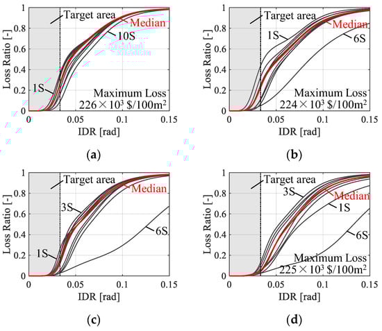 Based on the fragility models developed in the previous section, loss functions for structural components were created. Table 5 lists the assumed number of structural components per 100 square meters of floor area. The number of beam-end connections derived from building floor plans and other component counts were referenced from prior research []. Figure 12 illustrates the median loss functions across each story (from the loss function approximated by Equation (6) for the first story to the tenth story), along with a representative loss function for the entire building. The deformation range targeted in this study is also shown in Figure 12. Here, the loss function is expressed as the ratio of the repair cost to the replacement cost for each story.