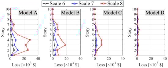 The median repair costs calculated using the response distributions (Section 4) and the loss functions (Section 5) are shown in Figure 13 and Figure 14. Figure 13 illustrates the distribution of repair costs per story for structural components. In Model A at Scale 8, repair costs in the second to fourth stories exceed USD 20,000 per story, with the most impacted fourth story reaching USD 28,000. Compared to the maximum structural replacement cost of USD 1,570,700 (based on a replacement cost of USD 226,000 per 100 m2 and a floor area of 695 m2), this loss represents about 1.8%. Considering the repair cost fragility for beam ends, beam ends classified as DS1 are approximately 60% of the cost of those classified as DS3, indicating that most structural components within these stories avoided significant damage. Conversely, in Models B and C, the highest costs were observed in the third and fourth stories, while Model D exhibited no pronounced cost peaks. In Model B, the ratio of the median IDR for the sixth story to that for the fifth story is 0.90, indicating minimal variation (Figure 10). Regarding the repair costs for the sixth story, which were notable in the loss function analysis (Section 5), the repair cost ratio relative to the fifth story is 0.96, consistent with the IDR ratio. This indicates that no significant variation in the loss function was observed within the deformation range studied.