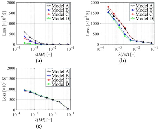 Loss assessment results for (a) structural components and (b) max IDR sensitive non-structural components; (c) PFA sensitive non-structural components.