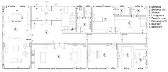 The field study was conducted on a residential building located in Turkey and monitored throughout its construction from May 2022 to April 2024. The building, situated on a 710-squar × 10-meter plot with a construction area of 355 square meters, consists of two floors: a basement and a ground floor. Designed with modern architectural features, the basement includes essential utility spaces such as a plumbing room, hydrophore room, generator room, storage area, and parking space, while the ground floor comprises common living areas, including an entrance hall, kitchen, living room, bedrooms, and bathrooms (see Figure 1). The building’s layout and construction phases reflect universally applicable principles frequently observed in contemporary residential architecture. Modern residential designs prioritize open and functional plans, spacious living areas, and dedicated utility rooms, all of which enhance both functionality and user comfort. This architectural approach aligns with design trends adopted in numerous countries and remains applicable across varied cultural and geographical contexts. Collectively, these elements suggest that the structure analyzed in this study exemplifies widely accepted principles in contemporary housing projects, ensuring its adaptability and relevance to residential construction standards in diverse regions.