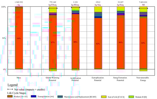 A review of the Global Warming Potential (GWP) data revealed the following distribution: The “Product” (A1–A3) stages accounted for 88.97% of the total, while the “Transportation” (A4) stage constituted 1.19%. The “Maintenance and Replacement” (B2–B5) stage accounted for 2.84%, the “End of Life” stage for 9.84%, and the “Module D” stage for −2.82%. The distribution of acidification data was as follows: The “Product” (A1–A3) stages accounted for 89.52%, “Transportation” (A4) for 1.34%, “Maintenance and Replacement” (B2–B5) for 4.34%, “End of Life” for 6.46%, and “Module D” for −1.65%. With regard to the potential for eutrophication, these data indicated the “Product” (A1–A3) stages contributed 82.80% to the total, while the “Transportation” (A4) stage contributed 2.14%, the “Maintenance and Replacement” (B2–B5) stage contributed 7.10%, the “End of Life” stage contributed 8.88%, and the “Module D” stage contributed −0.93%. With regard to the smog formation, the distribution was as follows: Data indicated that the “Product” (A1–A3) stages exhibited an 86.90% rating, while the “Transportation” (A4) stage demonstrated a 2.60% rating. The “Maintenance and Replacement” (B2–B5) stage and the “End of Life” stage were rated at 4.02% and 7.05%, respectively. The “Module D” stage exhibited a rating of −0.56%. Concerning data pertaining to “Ozone Depletion Potential”, the following was observed: The “Product” (A1–A3) stage exhibited a value of 48.02%, while the “Maintenance and Replacement” (B2–B5) stage demonstrated a value of 20.90%. The “Module D” stage exhibited a value of 31.08%. With regard to the category of “Non-renewable Energy Demand”, the distribution was as follows: The “Product” (A1–A3) stages exhibited an 87% prevalence, while the “Transportation” (A4) stage demonstrated a 1.77% occurrence. The “Maintenance and Replacement” (B2–B5) stage exhibited a 5.34% prevalence, the “End of Life” stage exhibited an 8.91% prevalence, and the “Module D” stage exhibited a −3.02% prevalence. With regard to the category of “Renewable Energy Demand”, data revealed the following distribution: “Product” (A1–A3) stages at 81.75%, “Transportation” (A4) at 0.45%, “Maintenance and Replacement” (B2–B5) at 14.48%, “End of Life” at 6.39%, and “Module D” at −3.06%.