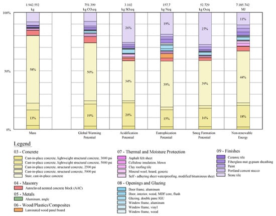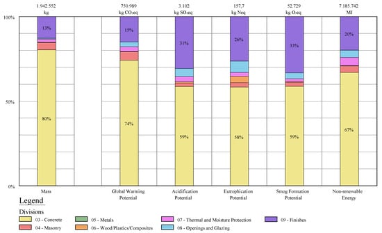 The distribution of the LCA analysis by material categories is presented in Table 8. When examining the environmental impact value for “Global Warming Potential (GWP)”, the distribution is as follows: 74.12% “concrete”, 15.05% “finishes”, 5.20% “masonry”, 2.77% “openings and glazing”, 2.77% “thermal and moisture protection”, and 0.09% “woods”. For the “Acidification Potential (AP)” environmental impact value, the distribution is 58.68% “concrete”, 30.74% “finishes”, 4.75% “openings and glazing”, 3.12% “thermal and moisture protection”, 1.89% “masonry”, and 0.81% “woods”. For the “Smog Formation Potential” environmental impact value, the distribution is 58.85% “concrete”, 33.26% “finishes”, 3.56% “openings and glazing”, 2.22% “masonry”, 1.65% “thermal and moisture protection”, and 0.46% “woods”. For the “Primary Energy Demand” environmental impact value, the distribution is 65.15% “concrete”, 20.23% “finishes”, 4.78% “openings and glazing”, 4.64% “thermal and moisture protection”, 4.10% “masonry”, and 1.10% “woods”. For the “Non-renewable Energy Demand” environmental impact value, the distribution is 67.01% “concrete”, 19.87% “finishes”, 4.78% “thermal and moisture protection”, 4.24% “openings and glazing”, 3.82% “masonry”, and 0.28% “woods”. For the “Renewable Energy Demand” environmental impact value, the distribution is 46.02% “concrete”, 23.94% “finishes”, 10.34% “openings and glazing”, 9.42% “woods”, 7.08% “masonry”, and 3.20% “thermal and moisture protection”.