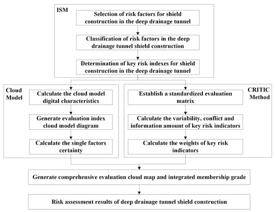 The risk assessment process of small-diameter shield construction in a deep drainage tunnel based on the ISM–CRITIC–cloud model.