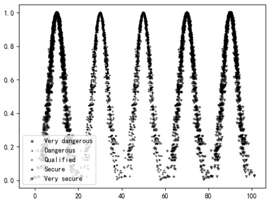 By referring to the relevant literature and norms, the evaluation criteria for the risk factors of the small-diameter shield construction of the deep drainage tunnel are divided into five grades: very dangerous, dangerous, qualified, secure and very secure [7,10]. Very dangerous means that the construction risk of the small-diameter shield in the deep drainage tunnel is very high, and the construction should be stopped immediately. The very dangerous scale is [0, 20). Dangerous means that the construction safety risk is high, and corresponding measures must be taken to reduce the construction safety risk. The dangerous scale is [20, 40). Qualified means that the construction risk can be accepted, and corresponding measures should be taken to reduce the safety risk. The qualified scale is [40, 60). Secure means that the construction risk is acceptable, it only needs to be monitored and the implementation of safety management measures need to be checked. The secure scale is [60, 80). Very secure means that the construction safety risk can be accepted without any additional measures being taken. The very secure scale is [80, 100].