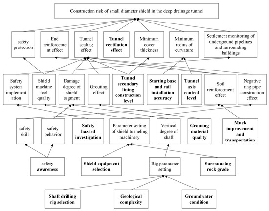 Level diagram of key risk factors for small-diameter shield construction of the Donghu deep drainage tunnel.