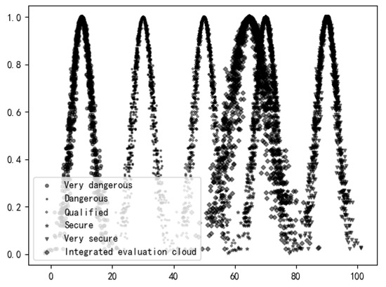 According to the characteristic values of the comprehensive evaluation cloud and standard cloud in Table 4, MATLAB2023a software is used to program and generate a key risk evaluation cloud map of small-diameter shield construction in the Donghu deep drainage tunnel, as shown in Figure 4.