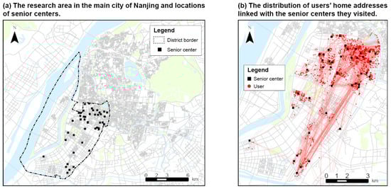 The research area in the main city of Nanjing (a) and the distribution of users’ home addresses linked with the senior centers they visited (b).