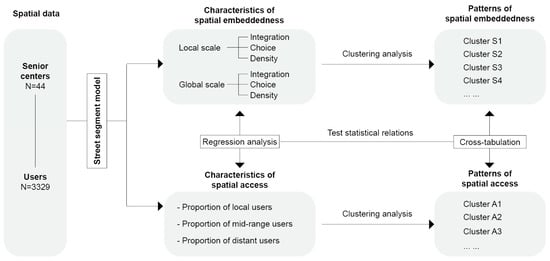 The analytic framework of this study is presented in Figure 2. We characterize the spatial embeddedness of senior centers following the methods of space syntax studies, that is, by describing how senior centers are connected to local- and global-scale street networks. As discussed in the Introduction, space syntax methods provide quantitative approaches to comprehensively describe how public places interact with multiple scales of spatial contexts, and they have been proven to relate to people’s movement patterns, which fit our research purpose in understanding the spatial embeddedness of senior centers and older people’s patterns of spatial access. In addition, we characterize senior centers’ patterns of spatial access by their proportions of local, mid-range, and distant users, which correspond to different scales of spatial contexts. In addition, clustering analysis is performed to identify patterns of spatial embeddedness and spatial access, allowing for an overall recognition of spatial patterns. Finally, statistical analysis is conducted to examine whether and how spatial access is influenced by spatial embeddedness. The details of the methods will be introduced in the following sections.
