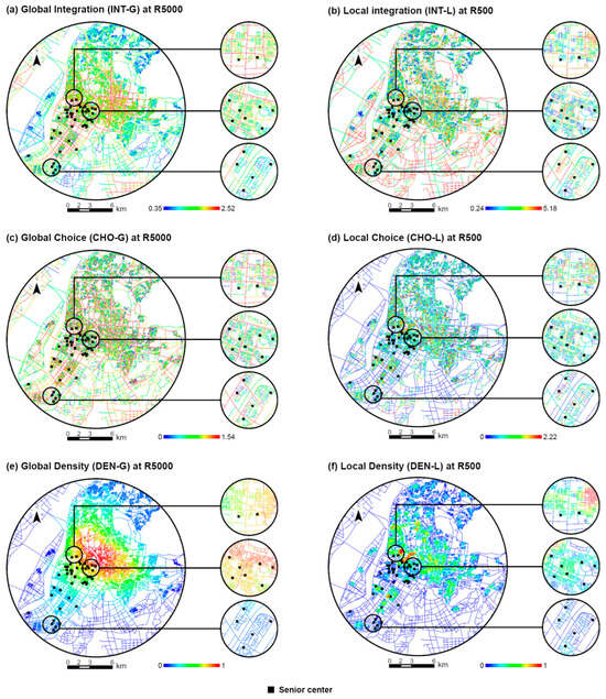 As shown in the above equations, the calculations of INT, CHO, and DEN are all based on defined radii (i.e., ), representing the scope or scale of the space taken into account when characterizing spatial embeddedness. In this study, we seek a comprehensive description of the spatial embeddedness of senior centers at multiple scales. Therefore, the three metrics (INT, CHO, and DEN) are calculated at the radius of 500 m and 5000 m, representing local and global scales, respectively. Thus, a total number of six metrics are generated to characterize patterns of spatial embeddedness, which are global integration (INT-G), local integration (INT-L), global choice (CHO-G), local choice (CHO-L), global density (DEN-G), and local density (DEN-L).