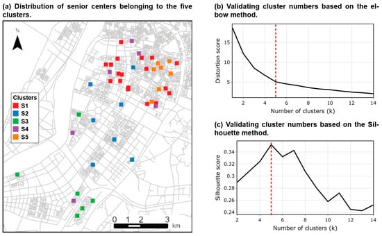 To identify patterns of spatial embeddedness and spatial access among senior centers, K-Means clustering analysis is performed based on related metrics. In previous urban street network studies, K-Means clustering algorithms based on multi-scale space syntax metrics have been employed to detect or identify spatial patterns [,]. To select the optimal number of clusters (k), this study employs both the elbow method and the Silhouette method [] for a more confident decision. The elbow method plots the distortion scores (sum of squared distance) of a range of values of k and identifies the one where the rate of decrease shifts (i.e., the elbow point) as the optimal k, while the Silhouette method identifies the k with the highest Silhouette score as the optimal one. Considering that the elbow point can be ambiguous to identify, we employ the method developed by Satopaa et al. [] to detect elbow points.