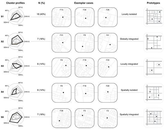 Based on metrics of integration, choice, and street density, K-Means clustering analysis was performed on the 44 senior centers to identify patterns of spatial embeddedness at local and global scales. As shown in Figure 4b,c, the elbow method and the Silhouette method both suggest five clusters. Figure 4a demonstrates the spatial distribution of senior centers belonging to the five clusters (S1 to S5). Detailed results of clustering analysis are shown in Figure 5, regarding the profiles, numbers, exemplar cases, and prototypes of senior centers belonging to the five clusters of spatial embeddedness. Prototypes in Figure 5 are proposed to illustrate key characteristics of the patterns of spatial embeddedness in each cluster.