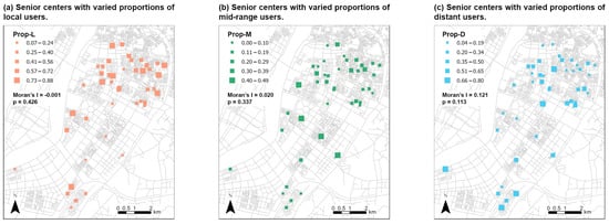 Figure 6 visualizes the distribution of senior centers with varied proportions of local, mid-range, and distant users. The figures seem to suggest that centers close to the inner city (those in the top-right corner) have a higher proportion of local users compared to those in the outer city (those in the bottom), and centers in the middle of Figure 6b have a higher proportion of mid-range users. However, spatial autocorrelation tests performed on the three metrics revealed no statistically insignificant relations, meaning that centers close to each other do not exhibit similar spatial access patterns. This implies that how centers are accessed by older people might be determined by more nuanced spatial variance, which will be discussed in Section 3.4.