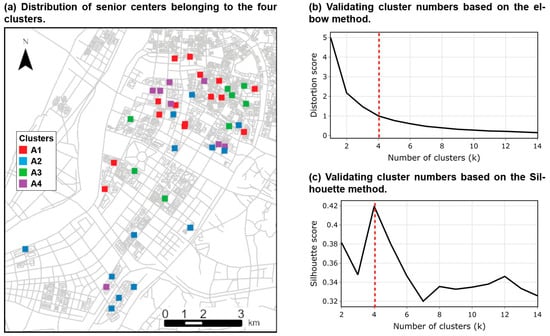 Results of K-Means clustering analysis of the characteristics of the spatial access of 44 senior centers, including the validation of cluster numbers based on the elbow method (b) and the Silhouette method (c), as well as the distribution of senior centers belonging to the four clusters (a).