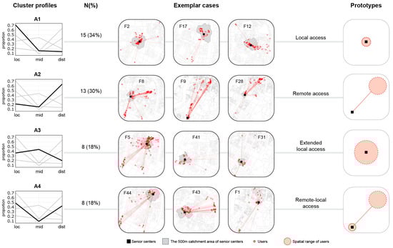 Based on proportions of local, mid-range, and distant users, K-Means clustering analysis was performed on the 44 senior centers to identify the patterns in which centers are accessed by older people. As shown in Figure 7b,c, the elbow method and the Silhouette method both suggest four clusters. Figure 7a demonstrates the spatial distribution of senior centers belonging to the four clusters (A1 to A4). Detailed results of clustering analysis are shown in Figure 8, regarding the profiles, numbers, and exemplar cases of senior centers belonging to the four clusters of spatial access.