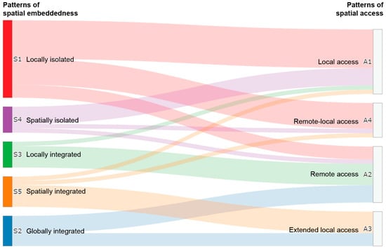In addition to the regression analysis, which revealed the impact of individual configuration factors, a cross-tabulation was created (see Table 3) along with a Sankey diagram (see Figure 9), aiming to show the relationships between patterns of spatial embeddedness and patterns of spatial access identify in Section 3.2 and Section 3.3. In other words, the analysis takes the patterns of spatial embeddedness as a composite measure to explore the collective impacts of configuration metrics.