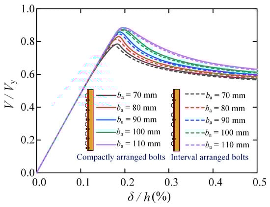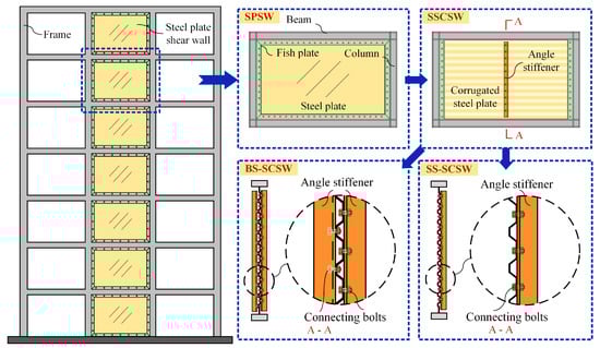 - A parametric study was performed on the shear-resistant behavior of SSCSWs. The ultimate bearing capacity of the SS-SCSWs could be enhanced with an increase in stiffener size, aspect ratio, and plate thickness, while an interval arrangement of bolts would hardly weaken the bearing capacity.