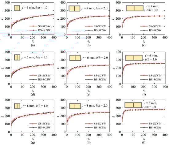 - In the shear elastic buckling analyses, the elastic equivalent flexural stiffness EIe with a coefficient of 0.45 in SS-SCSWs was proposed. It was proved to have high accuracy based on FE results. Similar elastic buckling modes and the same elastic transition stiffness ratio η0,e of 100 were obtained in SS-SCSWs and in BS-SCSWs.