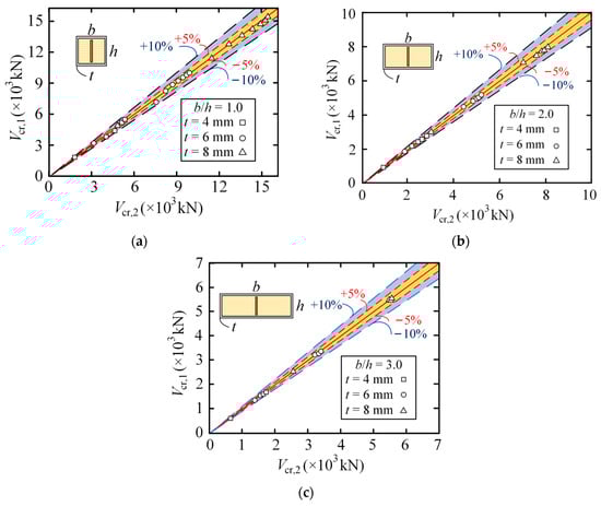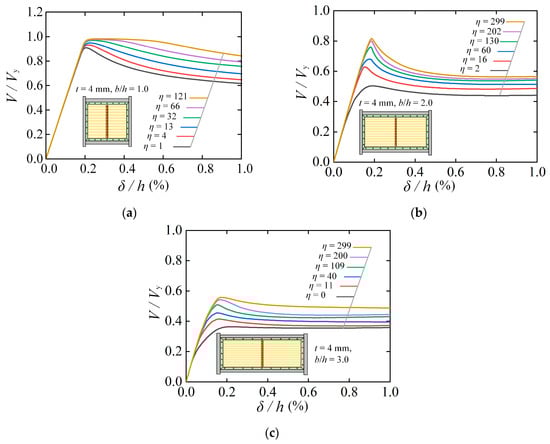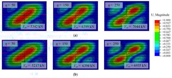 - An increase in the size of the stiffeners effectively improved the ultimate load Vu, and the improvement was significant when the aspect ratio of the plate was high. For instance, when comparing Vu for the same 6 mm plate as the stiffener size varied from minimum to maximum, Vu increased by 2.4% when the aspect ratio was 1, whereas Vu increased by 18% when the aspect ratio reached 3. This indicated that buckling was severe at a higher aspect ratio, and in such cases, installing stronger stiffeners was recommended.