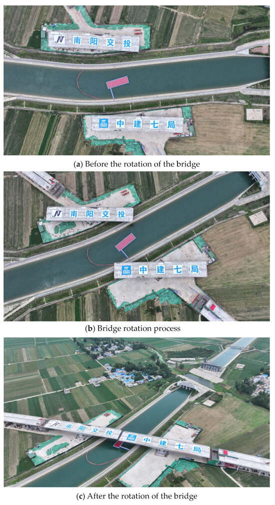 With the continuous economic growth of China over the past 30 years, transportation infrastructure construction, with bridge engineering at its core, has seen rapid development. In complex terrains or on operating rivers, railways, and highways where construction equipment cannot be deployed, traditional construction methods, such as the cantilever method or cast-in-place method, are no longer economical or practical. The rotation construction method is an innovative construction technique that assembles or pours the bridge’s main structure next to the predetermined axis using prefabricated spherical joints with low friction coefficients, and then uses a traction system to rotate the completed main structure onto the design axis, as shown in Figure 1. This method has the advantages of avoiding unfavorable terrain and not affecting navigation while also being able to save materials and accelerate construction schedules, leading to its widespread promotion and application. The increasing complexity and scale of bridge engineering pose significant challenges to the design of swivel bridges. During the process of the bridge achieving transverse rotation, stable control of the rotation process is a key consideration that must be taken into account [1,2,3,4,5].