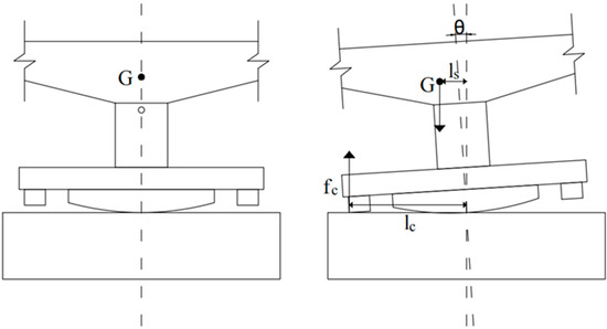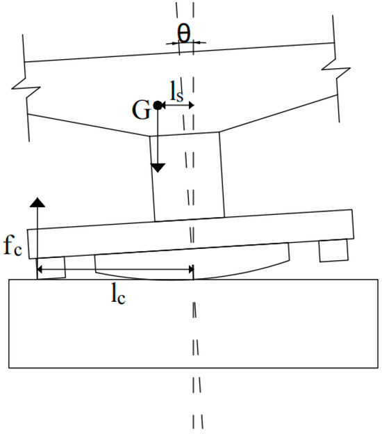 When the deflection angle is θ1, the locating pin just makes contact with the inner wall of the spherical joint, and the overturning moment of the bridge is primarily provided by the dead weight of the superstructure G. The resistance to overturning is primarily offered by the frictional force frc between the joint plates. When the deflection angle is θ2, the supporting foot just makes contact with the substructure bearing platform. The locating pin contacts the inner wall of the spherical joint and generates a reactive force fx, which contributes to the process of resisting the bridge’s overturning. When the deflection angle exceeds θ2, the supporting foot is in contact with the substructure bearing platform, at which time a reactive force fc is also produced to counteract the tendency of the superstructure to overturn.