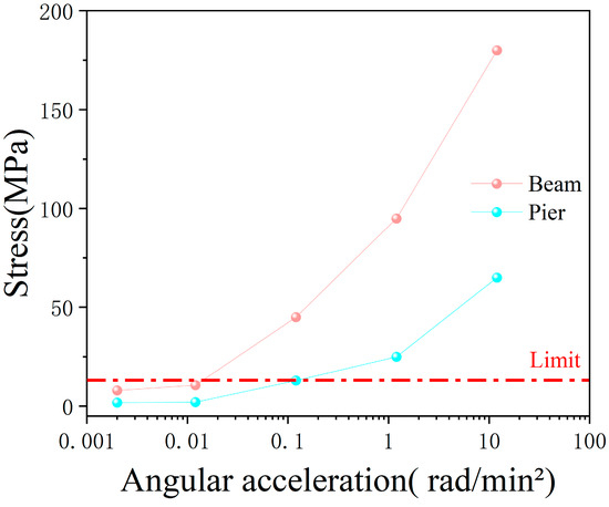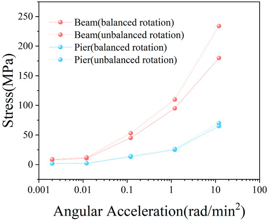 Under varying angular accelerations, the stress distribution within the bridge’s superstructure remained largely consistent, with high stress concentrations typically occurring at the connections between the main beam and the piers, as well as between the piers and the upper rotating table. During the rotation process, as the angular acceleration increased, the corresponding equivalent stress also rose, leading to a decrease in the stability of the rotating bridge.