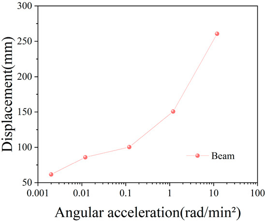 As shown in Figure 6, during the initiation and acceleration phase of the bridge rotation, the piers primarily experienced torsional forces, which decreased from the base upwards. Under the influence of inertial forces, the main beam exhibited tensile stress on one edge at the root and compressive stress on the other, with the highest stress values occurring at the root of the cantilever beam, diminishing towards the far end. When the angular acceleration increased to 0.012 rad/min2, the stresses in the two critical areas reached 10.66 MPa and 2.05 MPa, respectively, and the maximum displacement at the beam’s end was 89.65 mm. As illustrated in Figure 7, these values indicate that the bridge remained within the safe limits. During actual construction, excessive angular acceleration may cause vibrations in the main beam, affecting the structural forces. Therefore, it is crucial to precisely control the angular acceleration during on-site rotation construction to prevent such phenomena, ensuring it does not exceed 0.012 rad/min2.