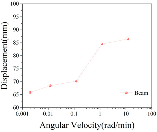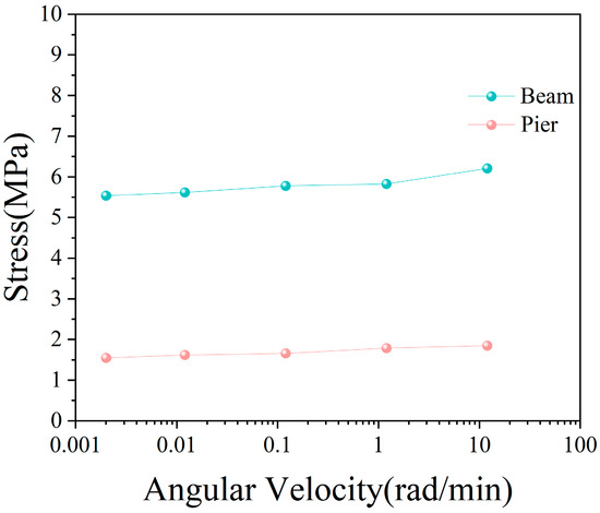 Based on the previously determined angular velocity values, we can generate the equivalent displacement cloud diagrams of the superstructure of the rotating bridge at different angular velocities, as shown in Figure 8. Under various angular velocities, the displacement distribution of the superstructure was roughly the same, with the cantilever end of the main beam being the area of greatest displacement in the superstructure. These results are similar to the displacement distribution when the bridge is at rest, and during the rotation process, the increase in displacement is not significant with the increase in angular velocity. Figure 9 shows that, at different angular velocities, the stress distribution of the superstructure is also roughly the same, with high-stress areas typically occurring at the connections between the main beam and piers and between the piers and the upper rotating table. During the rotation process, the increase in equivalent stress was not significant with the increase in angular velocity. In summary, the simulation results of the model are in good agreement with the actual situation, indicating that the parameters of the finite element model were reasonably set, and the computational results can be used for further analysis.