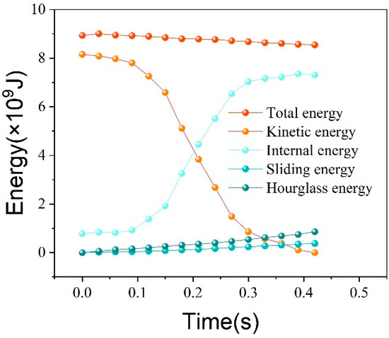 In this section, a model of the supporting foot impacting the sliding track at a speed of 2.4 m/s is selected to verify the law of energy conservation. Through calculations using the LS-DYNA R12.1.0, we obtained the energy variation curve, as shown in Figure 12.