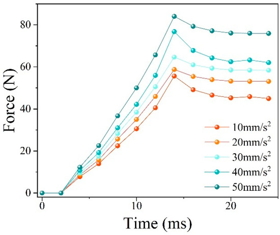 As shown in Figure 13, the variation trend of the reaction force time history curve of the lower rotating table was regular, and the extreme value of the reaction force increased with the increase in the impact acceleration. Before 8 ms, the reaction force increased with the growth of the impact acceleration, and at 12 ms, the reaction force tended to be stable.