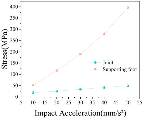 As shown in Figure 14, the maximum equivalent stress of the rotating bridge under different inclined impact speeds was concentrated on the rotating spherical joint and the foot components, and it significantly increased with the increase in the inclined impact speed. When the inclined impact acceleration was 10 mm/s2, the forces borne by both the joint and the foot resulted in a maximum equivalent stress of 18.95 MPa for the joint structure and 52.95 MPa for the steel foot. When the inclined impact acceleration increased to 20 mm/s2, the maximum equivalent stresses for the rotating spherical joint structure and the foot rose to 25.43 MPa and 117.37 MPa, respectively. As the inclined impact acceleration increased from 30 mm/s2 to 50 mm/s2, the stress change in the foot was particularly significant. At an inclined impact acceleration of 30 mm/s2, the maximum equivalent stresses for the rotating spherical joint structure and the foot increased to 33.79 MPa and 190.48 MPa, respectively, indicating that the structure was at a higher risk. When the inclined impact acceleration further increased to 50 mm/s2, the maximum stress in the foot approached 400 MPa.