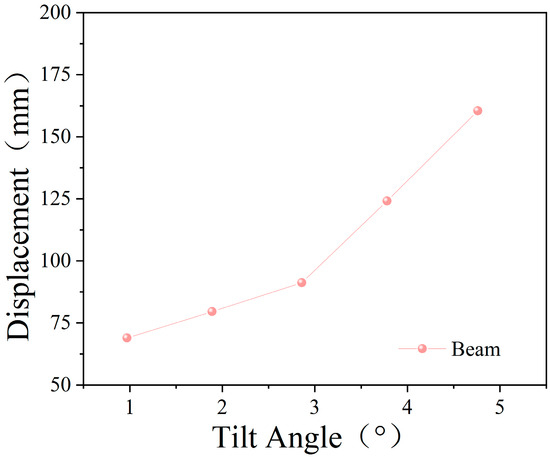 As shown in Figure 15, during the inclination process, the maximum displacement at the T-structure beam end increases continuously with the increase in the inclination angle. When the inclination angle reaches 4.76°, the maximum displacement of the rotating bridge at 0.25 s is 91.21 mm, and at 1 s, it is 160.51 mm, at which point the rotating bridge has already undergone an overturning instability motion. By extracting the friction force and centroid data at the interface of the rotating bridge’s spherical joint, the overturning moment and the anti-overturning moment at the 4.76° inclination angle can be calculated. Based on this, the anti-overturning stability coefficient of the rotating bridge at this time is found to be 0.94, indicating that, at the 4.76° inclination angle, the anti-overturning moment of the rotating bridge is less than the overturning moment, and the structure has experienced instability failure. Therefore, during the actual rotation process, the inclination angle of the rotating bridge should be controlled within 4° to ensure structural safety.