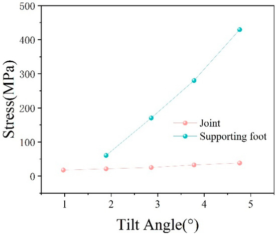The results of the five inclination angles calculated according to the aforementioned method are shown in Figure 16. It can be observed that, in the rotating bridges with different inclination angles, the maximum equivalent stress is concentrated on the rotating spherical joint and the foot components, and it significantly increases with the increase in the inclination angle. This indicates that the spherical joint structure and the foot are the most sensitive components to the rotation inclination reaction and can sensitively perceive the inclination state of the rotating bridge. When the inclination angle is 0°, the stress distribution in the spherical joint structure is uniform, with a maximum equivalent stress of 17.84 MPa. As the bridge begins to incline, the stress state of the spherical joint structure changes, and the maximum equivalent stress appears on the side tending towards the rotation centerline axis. When the inclination angle is 1.89°, the spherical joint and the foot bear the load together, with the maximum equivalent stress of the spherical joint structure being 21.53 MPa and that of the steel foot being 60.81 MPa. When the inclination angle increases to 2.86°, the maximum equivalent stress of the rotating spherical joint structure is 39.73 MPa, which is 92.4% higher than before the inclination, and the maximum equivalent stress of the foot is 179.48 MPa. This indicates that, during the transition from an inclination angle of 2° to 3°, the spherical joint is always within the safe range, but the stress change range of the steel foot is large. When the inclination angle reaches 3.78°, the maximum equivalent stress of the foot is 280.53 MPa, which is close to the yield strength of Q355 material, and the structure is in a high-risk state. Therefore, it is recommended to control the inclination angle within 3° during the rotation process. In the inclined state, the upper rotating table surface exhibits eccentric pressure, and as the inclination angle increases, the eccentric pressure stress on the upper rotating table surface gradually increases, which is caused by the offset of the center of gravity due to the inclination of the upper structure.