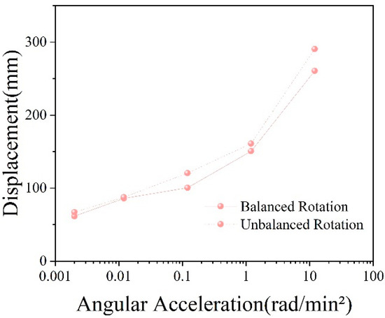 During the unbalanced rotation phase, the focus is placed on analyzing the stress on each part of the upper structure during the start-up acceleration phase and the constant-speed rotation phase. The engineering design of this rotating bridge has a rotation speed of 0.012 rad/min, a rotation angle of 69°, and a rotational acceleration of 0.09 rad/min2. To compare the balanced and unbalanced states, this section designs the same five sets of angular accelerations as Section 2, as shown in Table 3.