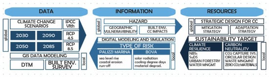 This methodological approach enables a one-to-one correspondence between various risk factors and the sites’ morphological, architectural and technological characteristics. By linking updated climate projections with specific environmental conditions, it is possible to analyze how global and local contexts interact under different climate change scenarios. Figure 4 illustrates the workflow, showing how data—such as climate projections and geospatial information—are transformed into actionable information through risk modeling and analysis. This ensures a direct and reciprocal interaction between climate projections and the built environment’s characteristics. The generated information guides the targeted use of resources, steering design decisions toward climate resilience and carbon neutrality.