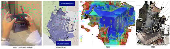 Detailed digital prototyping was conducted for the case studies using advanced surveying and modeling techniques. For Palazzo Mesiani in Bova, photogrammetric surveying with a drone was employed (Figure 5). This technique acquired high-resolution data of the terrain’s orography and morphological features. The collected images were processed using Agisoft Metashape Professional 2.0.4 software, generating detailed 3D models through Structure from Motion (SfM) and Multi-View Stereo (MVS) algorithms (Figure 6). The resulting three-dimensional digital prototype was utilized for subsequent analyses.