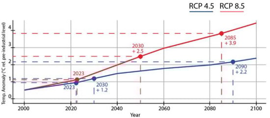 The collection of climate and environmental data for the case studies of Palizzi Marina and Bova was carried out in a systematic way, in line with the methodological framework. Data acquisition begins by drawing on the Meteonorm database. Meteonorm was used to carry out climate projections based on RCPs. In particular, two different RCPs were chosen to cover a wider range of possible climate futures and to assess the impact of climate change on different time horizons (Figure 8):