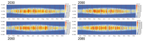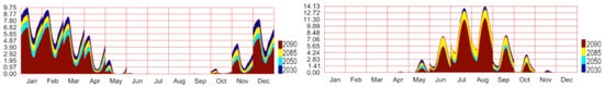 Site-specific future climate projections for Palizzi Marina and Bova were generated using Meteonorm software vers. 8 []. Representative Concentration Pathways (RCPs) 4.5 and 8.5 were selected, representing moderate and high emissions scenarios, respectively. These scenarios were used to generate climate projections for the key years 2030, 2050, 2085 and 2090. Meteonorm produced hourly climate files that include parameters such as air temperature, relative humidity, global solar radiation, wind speed and direction, precipitation and other relevant weather data.