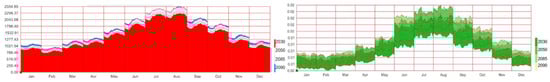 Similarly, the use of RCP 8.5 for 2050 and 2085 helps highlight the risks associated with a high emissions pathway in the medium term, providing crucial information on the adaptation and resilience of the built environment. In this initial data collection phase, the EPW files generated with Meteonorm were imported and localized using Ladybug. This tool was essential for visualizing and interpreting a series of climate charts related to solar irradiance [] (Figure 9), enthalpy variations [], humidity variations, heating degree days and cooling degree days [] for both study sites, Bova and Palizzi Marina. The analysis of this data allowed for a detailed understanding of the current and future climatic conditions of the two contexts.
