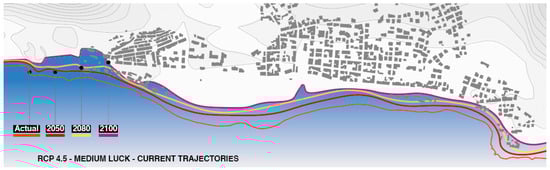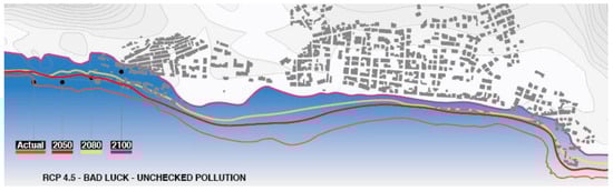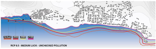 To assess the impact of sea level rise on Palizzi Marina, the Coastal Risk Screening Tool developed by Climate Central [] was utilized. This interactive tool allows you to visualize projections of sea level rise and potential coastal flooding risk under different climate and storm scenarios. By inputting precise geographical coordinates, projections of sea level rise under different RCP scenarios were obtained for the key years. The tool identified areas at risk of flooding and coastal erosion, highlighting vulnerable infrastructures, buildings and natural areas.