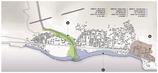 where Q is the run-off range; C is the run-off coefficient, specific to the type of surface; I is the intensity of precipitation; and A is the area of the surface considered. The development of this original script for the run-off calculation is a significant contribution to the advancement of research. The run-off coefficient C is a parameter that represents the fraction of precipitation that is not absorbed by the soil, evaporated or retained by vegetation, and which therefore flows to the surface []. The value of C varies from 0 to 1, where 0 indicates no run-off (all water is absorbed); 1 indicates that the water is not absorbed, so the run-off is maximum.