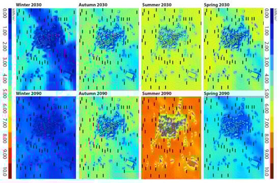 The graphs related to heating and cooling degree days (Figure 11) revealed a trend toward a decrease in heating requirements and an increase in cooling requirements. This approach, therefore, enabled the establishment of a one-to-one correspondence between future climate projections and the specific morphological, architectural, and technological characteristics of the study sites.