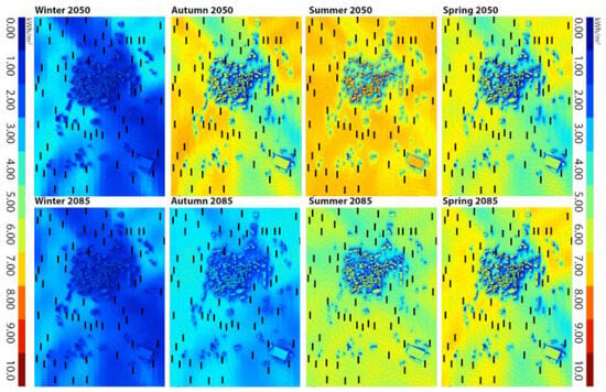 Similarly to the analysis of previous environmental data, an assessment of the intensity of rainfall in Palizzi Marina was carried out, using 2023 data [] as a reference and considering the maximum hourly precipitation value. Projections based on the RCP 4.5 and RCP 8.5 climate scenarios were carried out using Ladybug. The maximum hourly precipitation value recorded in 2023 was 35 mm/h during an intense event in November. The projections (Table 2) indicate an increase in both annual rainfall and maximum hourly rainfall intensity in Palizzi Marina. In particular, the maximum hourly intensity could increase to 40 mm/h by 2085 in the RCP 8.5 scenario.