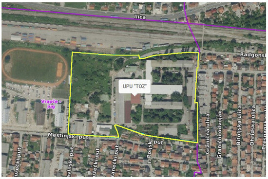 The site plan of the ‘TOZ’ pencil factory complex is marked with a yellow line. Source: Geoportal Grad Zagreb (https://geoportal.zagreb.hr/Karta, accessed 14 August 2024).