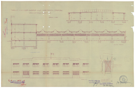 The first pencil factory ‘Koh-i-noor L. & C. Hardmuth’ established in Zagreb dates from 1936, when brothers R. and Š. Fürst from Zagreb and three partners—F. Hardmuth and F. Herring from České Budějovice and M. Salins-Spallek from Vienna—founded the public company and started manufacturing pencils and pastels in 1937 [71]. The first factory was on Baruna Filipovića Street 97 (later I. L. Ribara Street 91 and today’s Prilaz baruna Filipovića) in the Črnomerec district. Architect B. Šuperina designed the technical drawings of the factory in 1936 (Figure 5 and Figure 6).