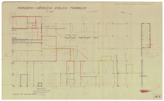The pencil factory ‘L. & C. Hardtmuth’ was founded in 1790 by Josef Hardtmuth in Vienna, Austria [72]. In 1848, the company was moved to Budweis (České Budějovice) in Czechia. In 1888, they introduced the ‘KOH-I-NOOR’ pencil. Today, the company operates under the name ‘KOH-I-NOOR HARDTMUTH’, although the company no longer belongs to the original owners of the Hardtmuth family [73]. The Czech manufacturer Hardtmuth established branches with the final stages of production, so imported goods were given a domestic form and various privileges. The wood was not processed in Zagreb and the mines were not produced outside the headquarters. It was not possible to import cedar wood from the USA during the Second World War, so wood processing and the production of mines started in Zagreb. On 4 March 1945, the factory was destroyed in an air raid on Zagreb West Station, and manufacturing was suspended [74]. The draft of destroyed and damaged parts of the buildings is shown in Figure 8.